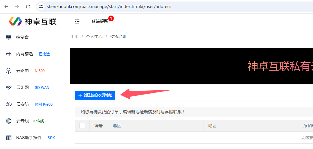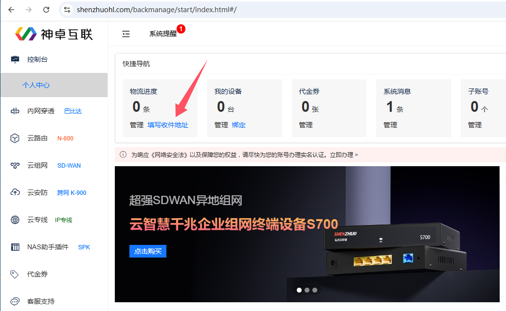 在神卓官网控制台,选择【控制台】-【个人中心】页面,点击如下图所示“填写收货地址”超链接。