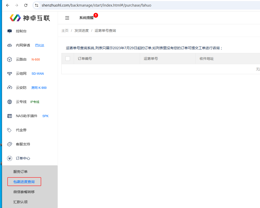 在神卓官网控制台,选择【订单中心】-【包裹进度查询】,在此页面可以实时查阅您的包裹动态!